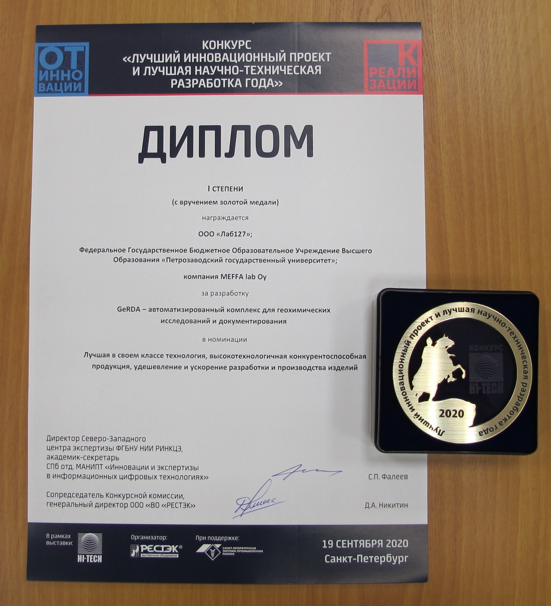 Разработка "GeRDA - автоматизированный комплекс для геохимических исследований и документирования" удостоена золотой медали в конкурсе лучших инновационных проектов и лучших научно-технических разработок года в номинации "Лучшая в своем классе технология, высокотехнологичная конкурентоспособная продукция, удешевление и ускорение разработки и производства изделий" на выставке "Петербургская техническая ярмарка ПТЯ-2020" (сентябрь, 2020 г.).